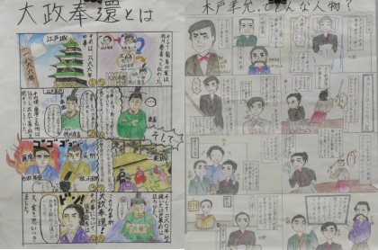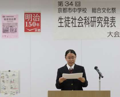 10月27日(土)から各地で開催されていた京都市中学校総合文化祭,10.11日に多くの展示や発表会が開催されました。東山区の漢字ミュージアムでは新聞展,生徒社会科作品展示,朗読コンクール,生徒社会科研究発表会が行われ,下京中学校からは社会科作品展示に優秀作品として1年生6名,2年生12名の作品が展示されました。そして社会科研究発表大会には,2年生がが夏休みに作成した明治維新8コマ漫画からのS.Iさんが「大政奉還」について,M.Sさんが「木戸孝允」について発表してくれました。急な発表になったのですが,落ち着いた様子で,しっかりと発表を行ってくれ,内容も本当に素晴らしいものでした。