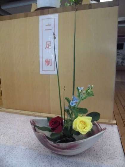 伝統文化部で,華道の練習として生け花に取り組みました。今回は,「バラ,ブルースター,フトイ」で作品を作りました。完成した作品は玄関に飾っています。