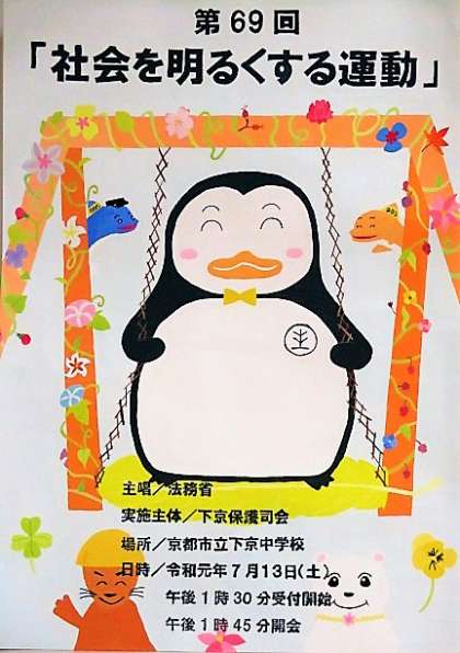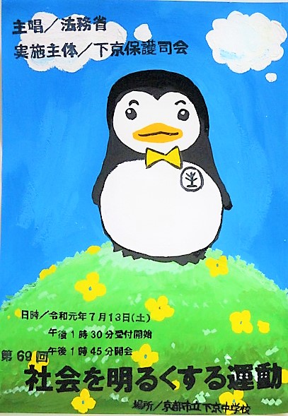 今年も「社会を明るくする運動」が,7月13日(土),下京中学校で行われます。この啓発ポスターを美術部員の皆さんが昨年に引き続き作製してくれました。3年Y.Rさん,K.Yさん,2年N.Aさんの3人が力作を作ってくれました。これらのポスターは今後,下京区内各地にに掲示されるそうです。当日は下京中学校吹奏楽部もPR活動に演奏で参加してくれます。