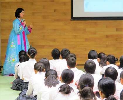 講師の文 真悠(ムン チニュ)先生は,見事な民族衣装を披露していただきましたので,続報で報告させていただきます。生徒たちは一生懸命講演に耳を傾けていました。