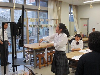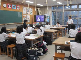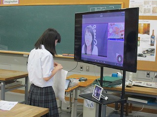 銅駝美工との連携で,美術部の部員がテレビ会議システムで,銅駝美術工芸高校の先生からの指導を受けました。2.3年生が,今,制作に取り組んでいる時代祭のポスターや今までの作品について,アドバイスを受けました。初めての体験で,しかもディスプレー越しの会話ということもあり,大人しい会話でしたが,銅駝美工の先生と作品制作についてのアドバイスを受けることができました。