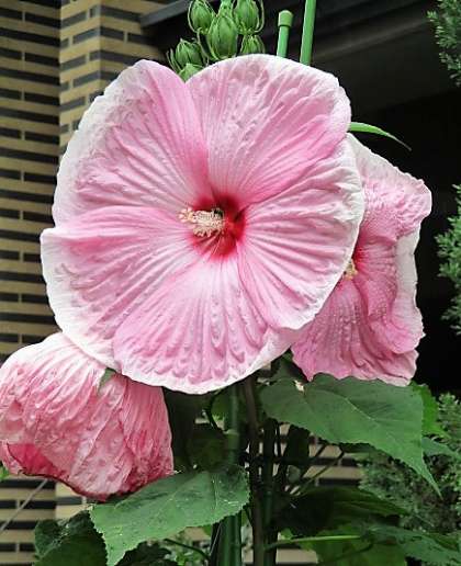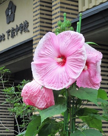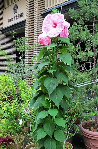 今年もアメリカ芙蓉が開花しました。今まで通り,大人の顔くらいの大きさの花です。12日(金)が一番花でした。下京中学校で3年目,昨年,地上部が枯れた後,株分けをしたので,今年は二鉢となりました。通りがかりの人がよく花の名前を訊かれるので,よく分かる名札を付けました。これから夏中順次花を咲かせるはずです。