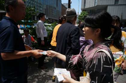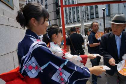 「ゆかた登校」の日に3年生は「京都アピールキャンペーン」を行いました。生徒達がつくったメッセージカード入りティッシュを四条烏丸へ配布しに行きました。