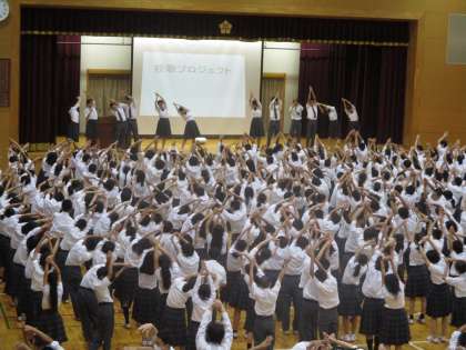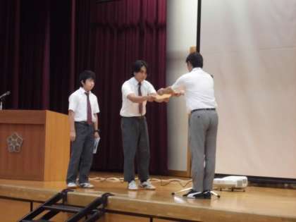 19日,志 風の式が行われました。式が始まる前に,伝達表彰があり,生徒会の取組である「校歌プロジェクト」が行われました。