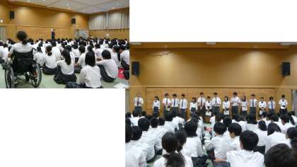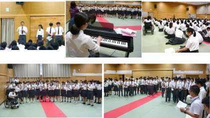まず、先日行われた球技大会の表彰式を行い、お互いの健闘をたたえあいました。続いて、進路の先生からのお話の後、夏季大会の選手激励会・結果報告会と学年合唱の練習を行いました。今回も代表委員や体育委員が中心となって立派に進行してくれました。