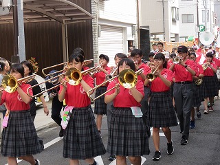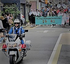 松原通は来春,下京雅小学校の新校舎の通学路になるということで,下京署一日署長のお二人,京都府警平安騎馬隊や松原通商店街のマスコット等などと一緒に行進しました。