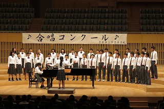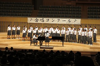 審査の結果は,金賞1年4組,銀賞1年1.5組でした。写真は1年1.6組,1年3組,1年4組の合唱の様子です。
