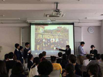 10月19日(土)に開睛館小中学校で「ALT・留学生と生徒の交流会」が行われました。下京中学校からは3年生女子2名が参加しました。ALTの先生や,日本の大学で勉強している外国人留学生,日吉ヶ丘高校の生徒のサポートのもと,他の中学校の参加者と,清水寺や建仁寺など近くの観光スポットを巡り,英語を用いて日本に訪れている外国人観光客の方たちにインタビューを行い,交流を図りました。最後にグループでインタビュー内容をまとめて発表を行いました。