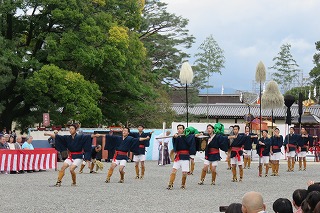 時代祭巡行の朝,5時前から地域の方々が学校に集まり,着付けや準備をされました。お迎え行列,学区内巡行の後,12時から京都御所を巡行は出発しました。