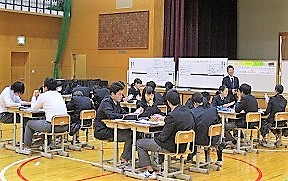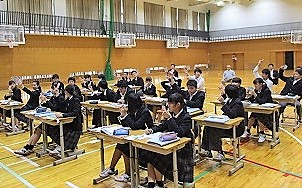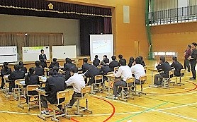 第52回全国中学校社会科教育研究大会・第25回近畿中学校社会科教育研究大会の京都市大会が11月7.8日(木.金)京都市勧業会館「みやこめっせ」で行われ,本校からは田華先生が3年4組の公開研究授業をされます。その授業と同じ授業を今日は体育館で3年2組の生徒で行われました。普段とは全然違う雰囲気の中での授業でしたが,生徒たちはいつも通りにきちんと授業を受け,考え,相談し,発表し,学んでいました。