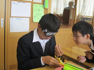 今日は2年生の全クラスで,技術家庭科の家庭領域の「高齢者への理解を深める体験授業」を行いました。京都市老人福祉協議会からのゲストティーチャーのお話を聞き,高齢者の困りについての体験活動と介助体験を行いました。ゴーグルを着けて視力が落ちた体験,装具を着けて動きにくくなった体験を実際に行い,また適切な介助の仕方についても学びました。