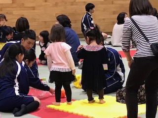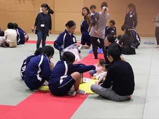 今日は3年3組の生徒たちと修徳児童館の子供たちの保育実習がありました。笑顔を見せながらの実習でした。