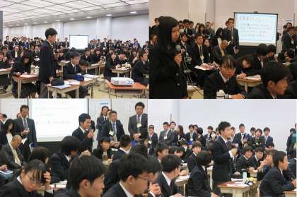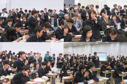 第52回全国中学校社会科教育研究大会 京都市大会・第25回近畿中学校社会科教育研究大会京都市大会が11月7・8日(木・金)岡崎のみやこめっせで開かれました。2日目の公民的分野の公開授業は3年4組の授業が公開されました。200名近い参観者の中,生徒は必要以上に緊張することなく、しっかりと授業を受け,自分の意見を堂々と発表していました。授業終了後は全国からの参観者から大きな拍手を受けていました。授業内容,各個人,班の発表も本当に素晴らしいものでした。知っている役員の先生方からも賞賛の声を多数聞くことができました。