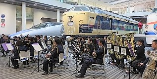 下京中学校吹奏楽部は府警音楽隊とコラボ演奏会を行い,本館1階の3種類の車両の展示スペースで見事な演奏を披露しました。