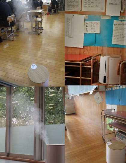 エアコン暖房でどうしても湿度が下がってしまう教室の環境を少しでも良くしようと稼働しています。湿度を適度に上げることにより,インフルエンザとかぜの予防と蔓延を防ぐ目的です。