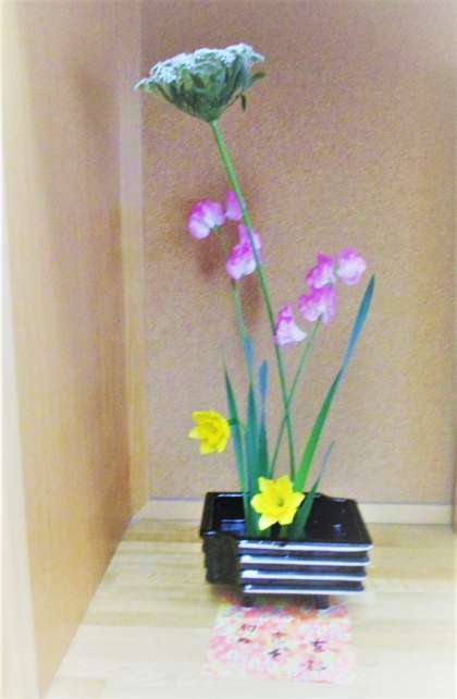 昨日,伝統文化部の生け花を掲載しましたが,もう一人の作品がありましたので,遅れましたが,掲載します。見事に玄関を飾ってくれています。