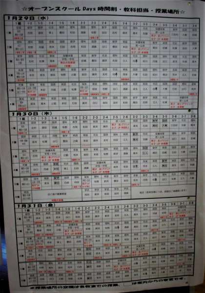 今日29日(水)から3日間,オープンスクールdaysとなっています。保護者の皆様,ご来校の上,ご自由に参観してください。時間割等は事前にお配りしています。念のため,時間割も掲載しておきます。初日の今日は約50人の保護者の方に来校頂きました。明日明後日,ご都合がつく方は是非ご来校ください。