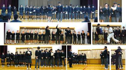まずはじめに教職員からの受験激励ビデオメッセージを視聴し、続いて決意や団結を示すクラス発表や決意カード貼り、そして最後は校歌を元気よく歌って締めくくりました。