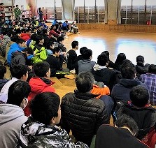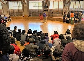 入所式を終えて昼食を食べてます。このあとは、楽しみにしていた雪遊びです。