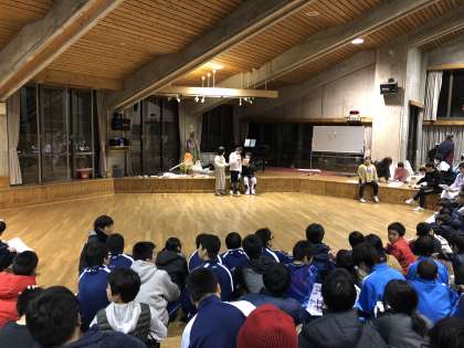 写真は昨日の交流会の様子と,今朝の朝の集いの様子です。