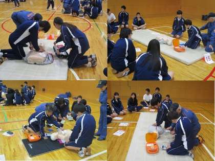 2月17日(月)3.4限,2年生は体育館で普通救命講習を受けました。胸骨圧迫法による心肺蘇生法とAEDの使い方について講習を受けました。多くの方に丁寧に教えてもらい,実際に救助が必要な場面に遭遇した時に実践できるように,生徒たちは真剣に取り組んでいました。ご家庭でも復習して,いざという時に役立てるようにしておいてもらえると良いでしょう。