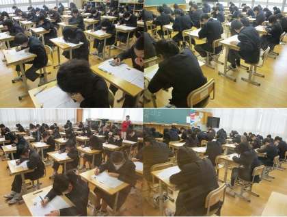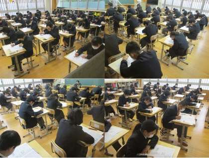 今日,26日から1・2年生は今年度最後の定期テストに取り組んでいます。1限の学充の時間から,どのクラスも全員真剣な眼差しで取り組んでいます。日頃の学習の成果が発揮されるよう,心身の状態をベストにしてあと2日間も取り組んでください。