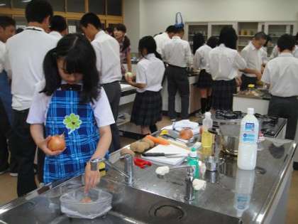 2日(火)午前中は、レクレーションを中心に、参加者の交流を図りながら昼の準備をしています。メニューはカレーです。準備した材料で、グループごとに工夫を凝らして調理をしています。