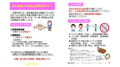6月21日 京都府への「緊急事態措置」が解除されるとともに,新たに7月11日までを期間とする「まん延防止等重点措置」が発令されました。