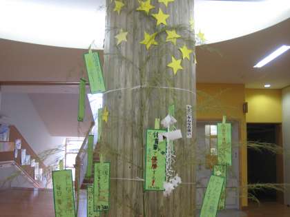 また、各クラスの願いを書いた短冊を笹につるして、1階のホールに展示して