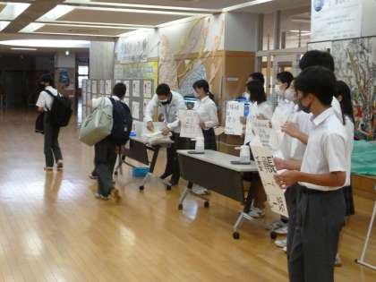 ちょうど手指消毒のアルコールの前あたり,多くの生徒が登校時に足を止めるあたりでポスターをもって活動。
