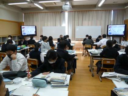 テレビモニターが四隅にある学習室での社会の授業の様子です。