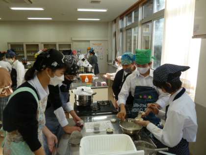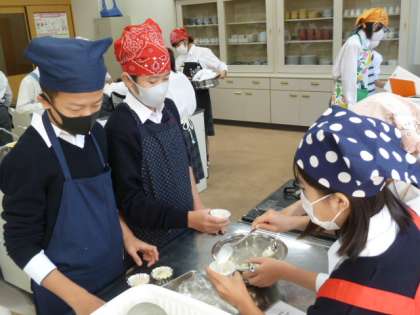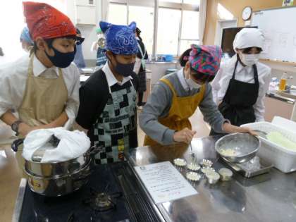 1年生が家庭科の調理実習で蒸しパンを作っています。