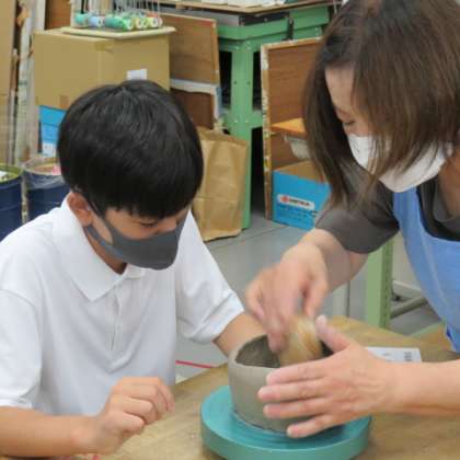 先生方に教わりながら,スプーンやスポンジ,面白い形の木の道具を使いながら,真剣な表情で器の表面をならしている様子です。
