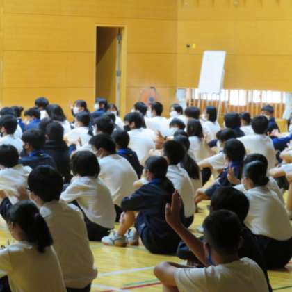 写真2枚目は「私の子どもは第〇世になると思いますか?」という問いかけに,挙手で答える2年生の様子です。