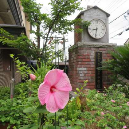 昨年はなかなかつぼみがつかなかった玄関のアメリカ芙蓉,今年は夏休みを待たずに大輪の花を咲かせました。