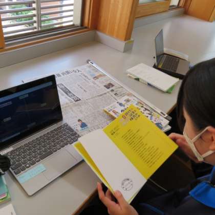 GIGA端末だけでなく,新聞,本なども使いながら,近くの人の画面を見比べながらの活動です。