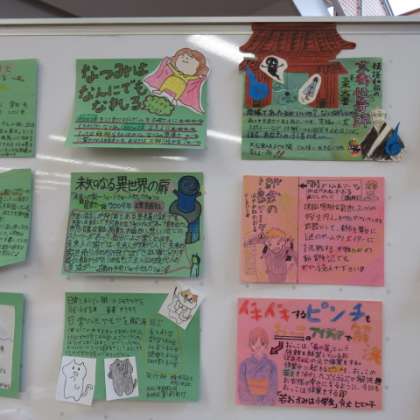 1年生が夏休みの宿題で作成したおすすめの本のpopが図書館に展示されています。