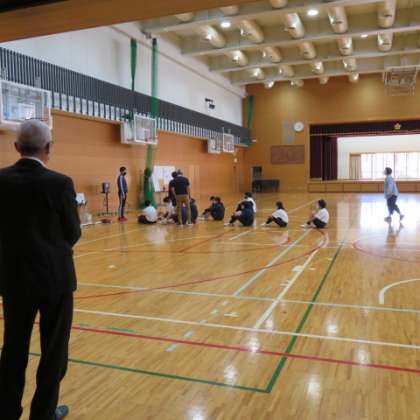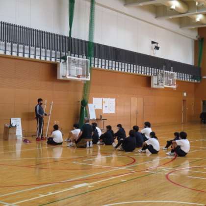 写真は,準備運動をていねいに行った後,ネットの立て方の説明が行われているところです。