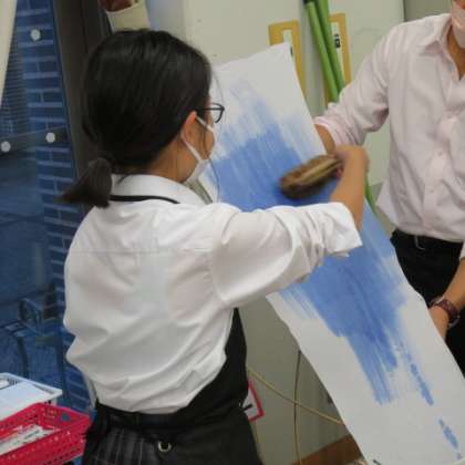 手ぬぐいサイズの白い布に先生が刷毛で染料を乗せていく様子を,食い入るように見つめる部員たち。