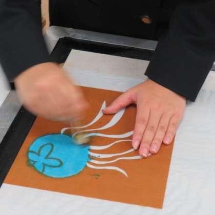 写真は薄く地色を付けた布の上に型紙を乗せて染めているところです。
