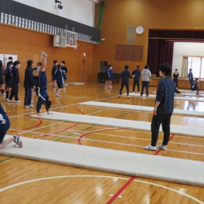 大学の先生も見に来られて,緊張気味の実習生を横目に,スイスイ倒立前転の大技を決める3年生。