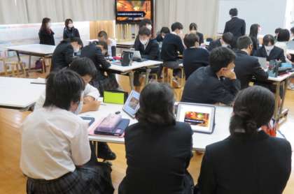 各教室に1〜3年生が分散して集まり,1年生の班から順番に発表を始めています。
