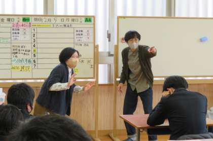 その後,1組さんのリクエストにもこたえながら「ゲームに出てくるような怪物がいるようなダンジョン」や「合同運動会に行くバスに乗り合わせた乗客の人」などなど,即興でいくつもの劇を間近で見ることができました。