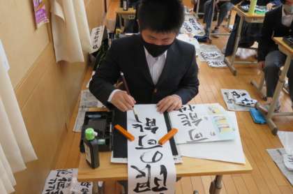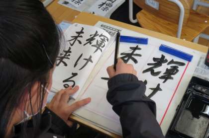 国語の授業では新年の書初め練習の真っ最中。