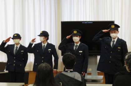 少年サポートセンターで体験中の4名が、警察官になりきって「非行防止教室」を地域交流ルームで行いました。
