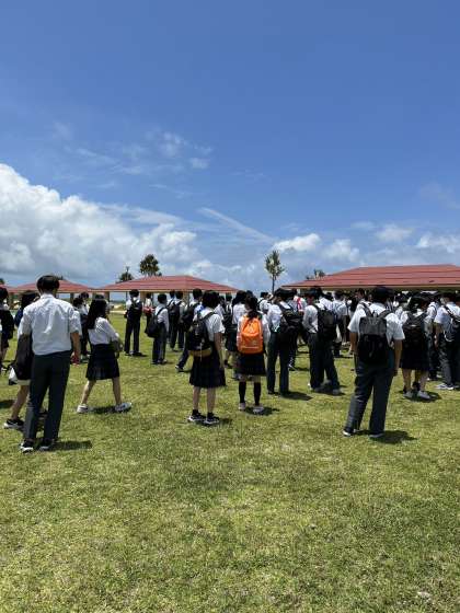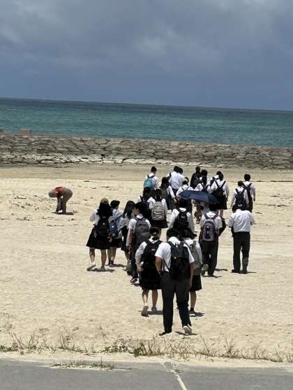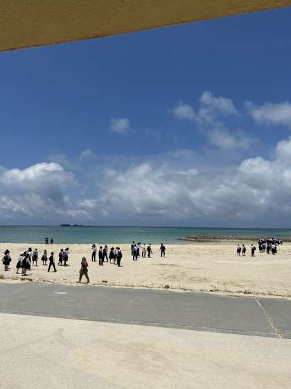美らSUNビーチに到着。あずまやが少ししかないので担任じゃんけんで日陰の争奪戦となりましたが、負けたクラスはビーチに向かって、かえって気持ちよさそうです。