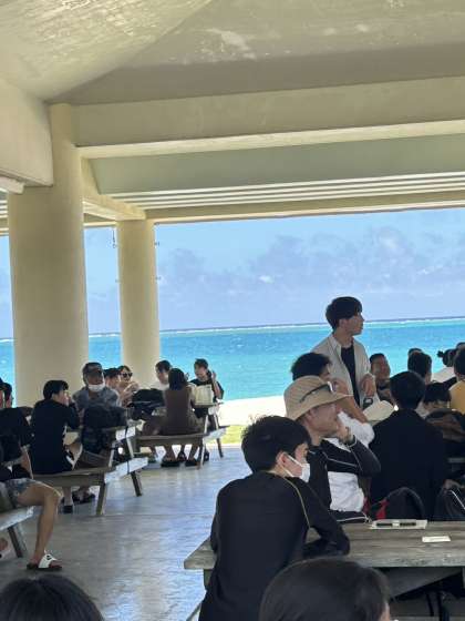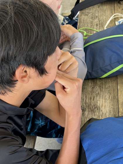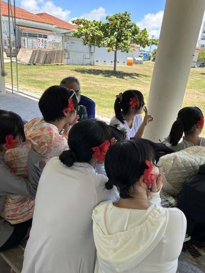別れを惜しみつつ退村式を待つ様子。教えてもらった指笛は、あと少しでコツを掴めそう(民泊の方談)
