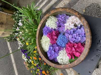 枝が垂れていたり,陰になって見えにくい花を採ってきて、花水盆(花手水)を今年も作ってみました。