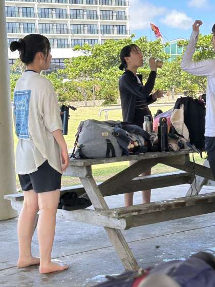 水分補給休憩中。みんなお風呂にでも浸かったようです。「整ったー!」とのこと。