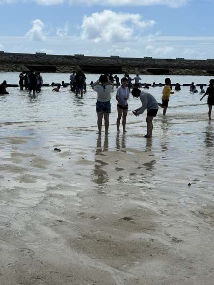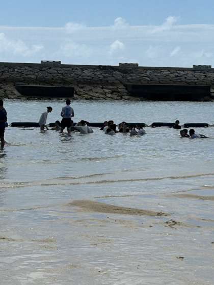 干潮と重なったため、潮干狩りみたいな状態の浜辺。へこたれずに寝そべりながら海水に浸かる中学生。